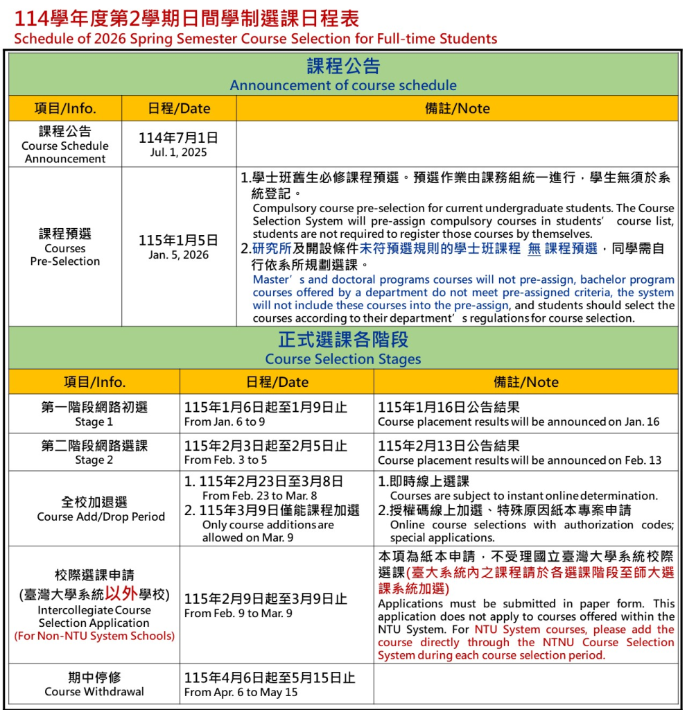114學年度第2學期日間學制(碩博班)選課日程表